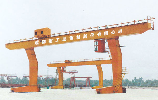 門式起重機(jī)是橋式起重機(jī)的一種變形,又叫龍門吊。主要用于室外的貨場、料場貨、散貨的裝卸作業(yè)。它的金屬結(jié)構(gòu)像門形框架,承載主梁下安裝兩條支腳,可以直接在地面的軌道上行走,主梁兩端可以具有外伸懸臂梁。門式起重機(jī)具有場地利用率高、作業(yè)范圍大、適應(yīng)面廣、通用性強(qiáng)等特點(diǎn),在港口貨場得到廣泛使用。